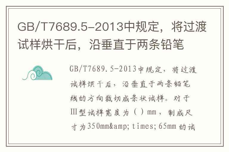 GB/T7689.5-2013中规定,将过渡试样烘干后,沿垂直于两条铅笔线的方向裁切成条状试样。对于Ⅰ型试样宽度为()mm ,制成尺寸为350mm×65mm 的试样。A.10 B.25 C.40 D.65