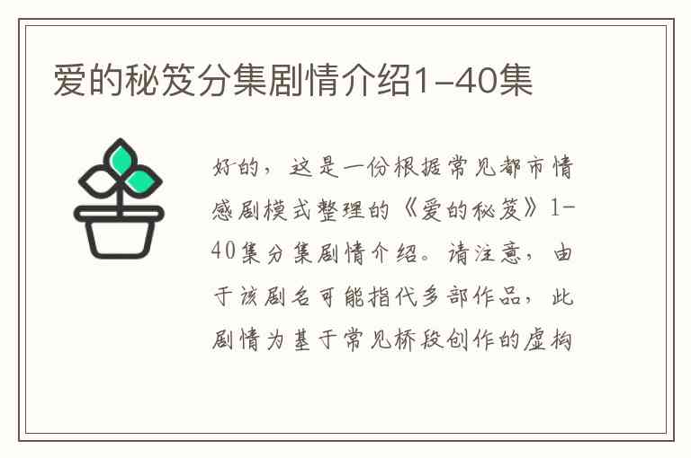 好的,这是一份根据常见都市情感剧模式整理的《爱的秘笈》1-40集分集剧情介绍。请注意,由于该剧名可能指代多部作品,此剧情为基于常见桥段创作的虚构版本,旨在提供一个连贯且详细的故事脉络。
