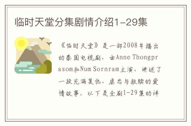 《临时天堂》是一部2008年播出的泰国电视剧,由Anne Thongprasom和Num Sornram主演,讲述了一段充满复仇、虐恋与救赎的爱情故事。以下是全剧1-29集的详细分集剧情介绍: