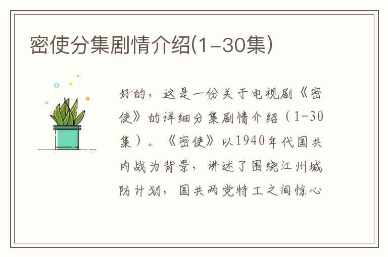 好的,这是一份关于电视剧《密使》的详细分集剧情介绍(1-30集)。