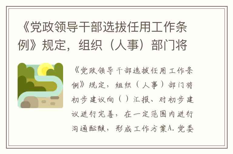 《党政领导干部选拔任用工作条例》规定,组织(人事)部门在形成干部选拔任用工作方案前,需将初步建议向党委(党组)主要领导成员汇报并完善。这一程序体现了干部选拔中“民主集中制”原则,既确保组织部门专业意见的独立性,又强化党委(党组)对选人用人工作的领导核心作用。
