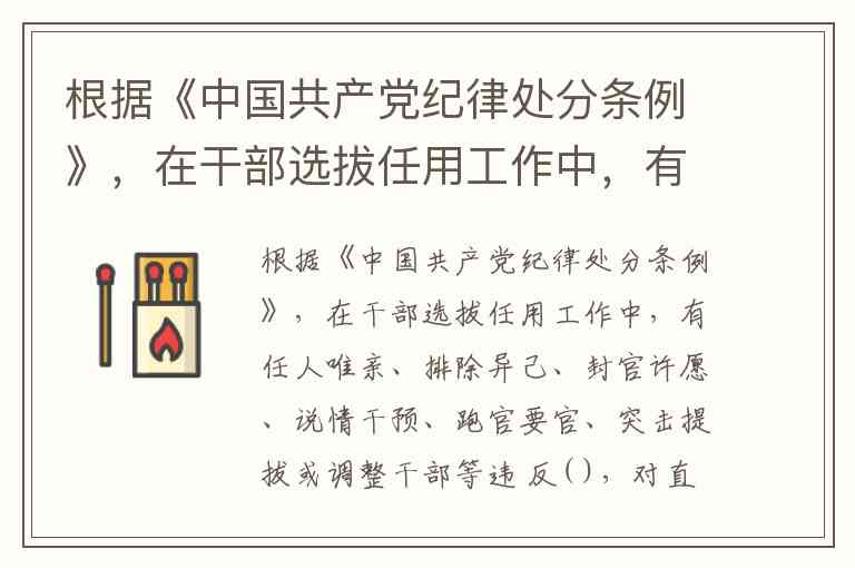 根据《中国共产党纪律处分条例》,在干部选拔任用工作中,有任人唯亲、排除异己、封官许愿、说情干预、跑官要官、突击提拔或调整干部等违 反( ),对直接责任者和领导责任者,情节较轻的,给予警告或者严重警告处分;情节较重的,给予撤销党内职务或者留党察看处分;情节严重的, 给予开除党籍处分。A.民主集中制原则 B.议事规则 C.干部选拔任用规定 D.组织纪律