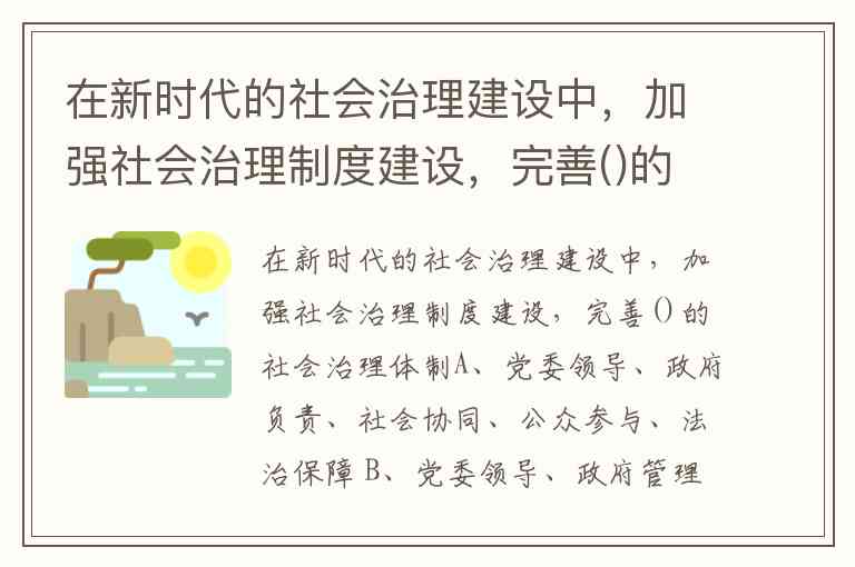 在新时代的社会治理建设中,加强社会治理制度建设,完善()的社会治理体制A、党委领导、政府负责、社会协同、公众参与、法治保障 B、党委领导、政府管理、社会参与、公众推进、法治保障 C、政府领导、党委协调、社会协同、公众推进、法治协同 D、政府领导、党委协调、社会参与、公众参与、法治协同