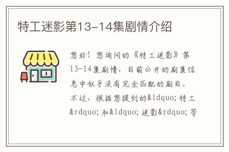 您好!您询问的《特工迷影》第13-14集剧情,目前公开的剧集信息中似乎没有完全匹配的剧目。