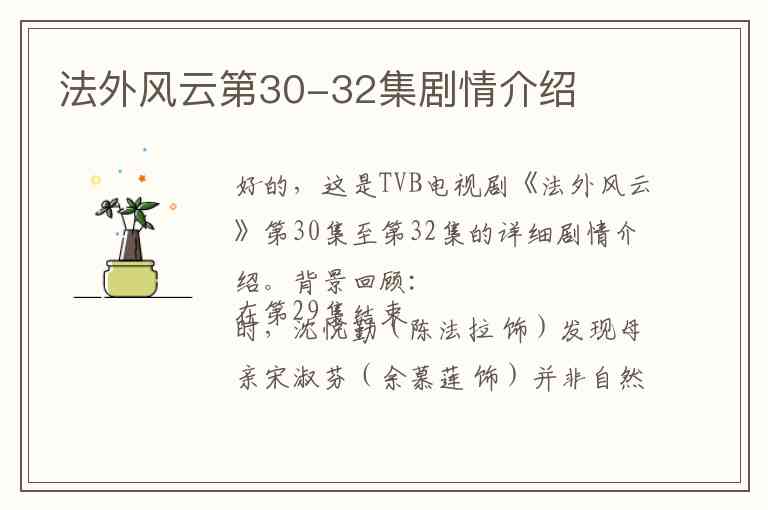 好的,这是TVB电视剧《法外风云》第30集至第32集的详细剧情介绍。