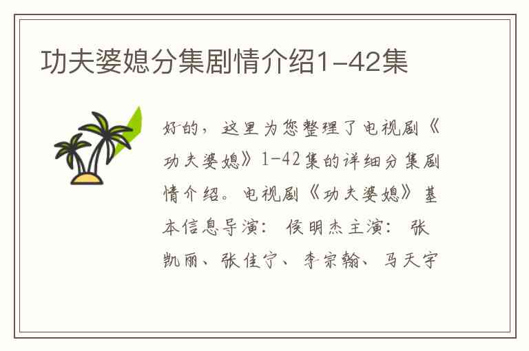 好的,这里为您整理了电视剧《功夫婆媳》1-42集的详细分集剧情介绍。