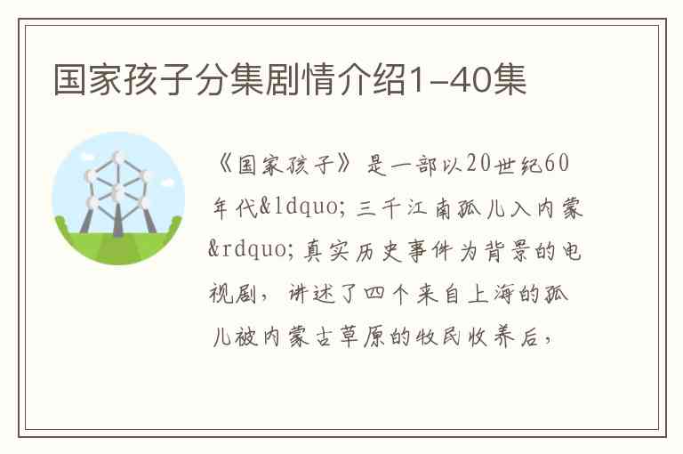《国家孩子》是一部以20世纪60年代“三千江南孤儿入内蒙”真实历史事件为背景的电视剧,讲述了四个来自上海的孤儿被内蒙古草原的牧民收养后,在不同家庭中成长、生活,并与他们各自的养父母、兄弟姐妹之间发生的感人至深的故事。