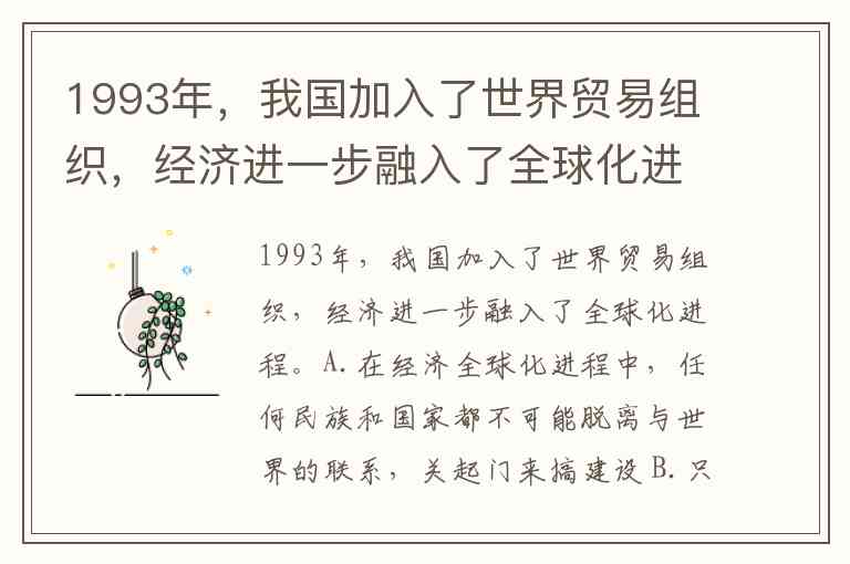 1993年,我国加入了世界贸易组织,经济进一步融入了全球化进程。A.在经济全球化进程中,任何民族和国家都不可能脱离与世界的联系,关起门来搞建设 B.只要主动融入经济全球化进程中,就能促进本国经济发展,增强本国经济实力 C.经济全球化可以促进各国经济合作和发展,也使本国经济更容易受到不利影响 D.在经济日益全球化的今天,一个国家的经济危机,可能扩散影响到其他国家的经济发展