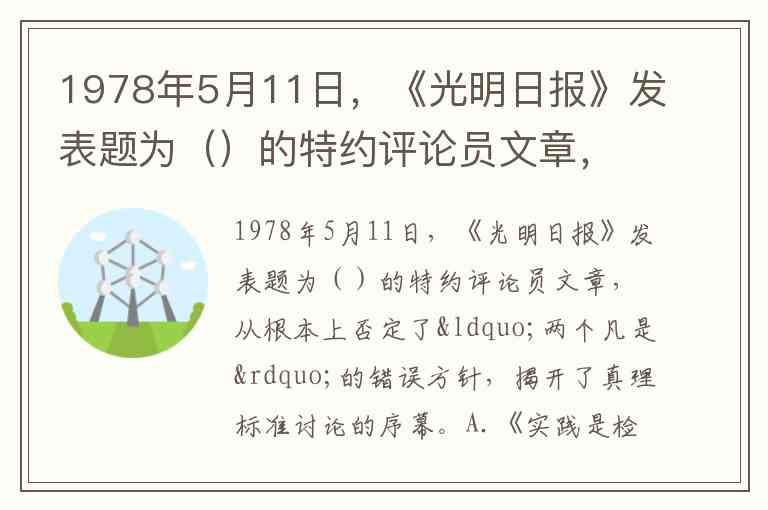 1978年5月11日,《光明日报》发表题为()的特约评论员文章,从根本上否定了“两个凡是”的错误方针,揭开了真理标准讨论的序幕。A.《实践是检验真理的唯一标准》 B.《一切主观世界的东西都要接受实践的检验》 C.《马克思主义的一个最基本的原则》