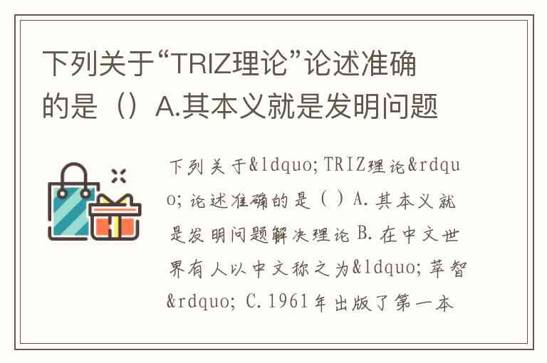 下列关于“TRIZ理论”论述准确的是()A.其本义就是发明问题解决理论 B.在中文世界有人以中文称之为“萃智” C.1961年出版了第一本有关TRIZ理论的著作《怎样学会发明创造》 D.其基本概念包括矛盾、演化、资源和理想度 E.20世纪70年代中期,TRIZ理论开始传入中国