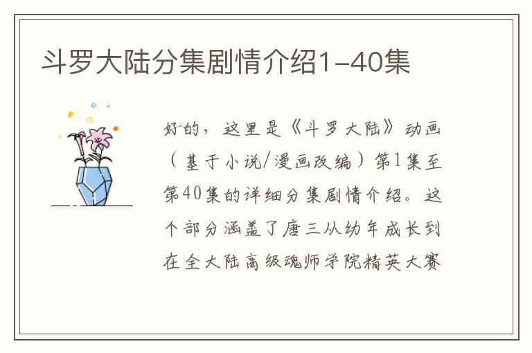 好的,这里是《斗罗大陆》动画(基于小说/漫画改编)第1集至第40集的详细分集剧情介绍。这个部分涵盖了唐三从幼年成长到在全大陆高级魂师学院精英大赛上初露锋芒的关键剧情。