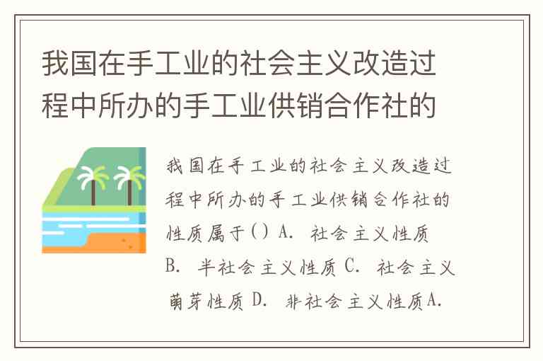我国在手工业的社会主义改造过程中所办的手工业供销合作社的性质属于( ) A.社会主义性质 B.半社会主义性质 C.社会主义萌芽性质 D.非社会主义性质A.社会主义性质 B.半社会主义性质 C.社会主义萌芽性质