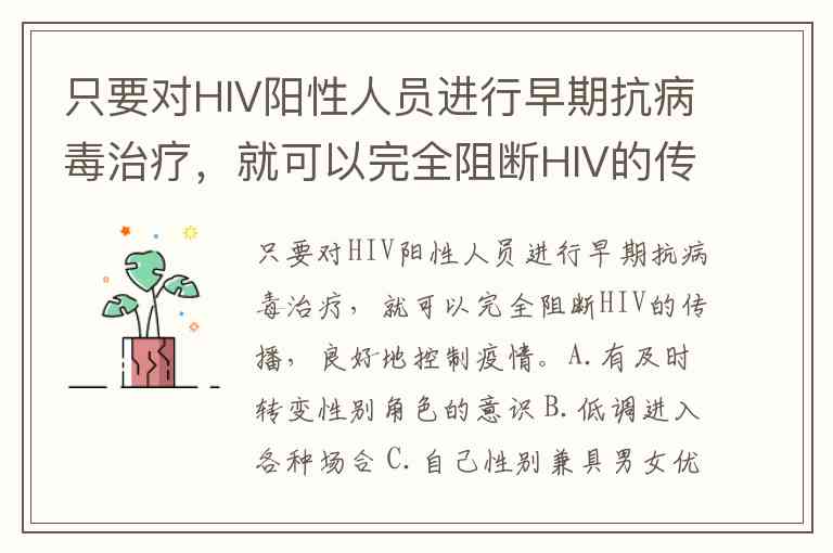 只要对HIV阳性人员进行早期抗病毒治疗,就可以完全阻断HIV的传播,良好地控制疫情。A.有及时转变性别角色的意识 B.低调进入各种场合 C.自己性别兼具男女优势 D.认清场合对自己性别要求 E.审时度势 F.事先做好功课