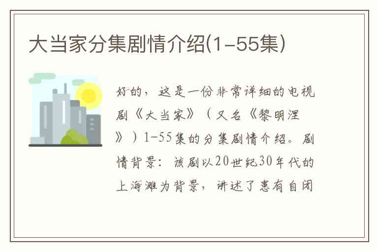 好的,这是一份非常详细的电视剧《大当家》(又名《黎明涅槃》)1-55集的分集剧情介绍。