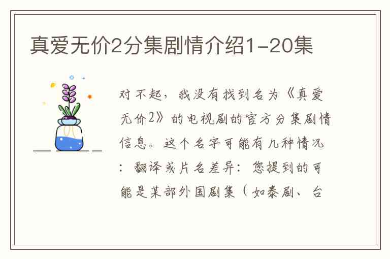 对不起,我没有找到名为《真爱无价2》的电视剧的官方分集剧情信息。这个名字可能有几种情况: