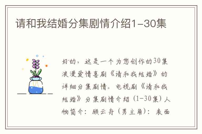 好的,这是一个为您创作的30集浪漫爱情喜剧《请和我结婚》的详细分集剧情。