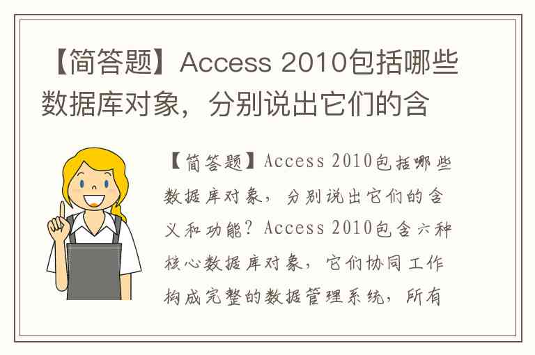 【简答题】Access 2010包括哪些数据库对象,分别说出它们的含义和功能?