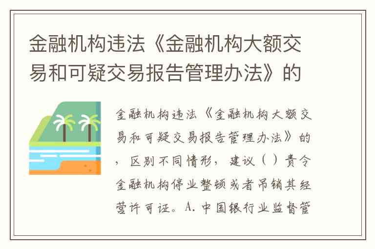 金融机构违法《金融机构大额交易和可疑交易报告管理办法》的,区别不同情形,建议()责令金融机构停业整顿或者吊销其经营许可证。A.中国银行业监督管理委员会 B.中国人民银行 C.公安机关 D.工商行政机关