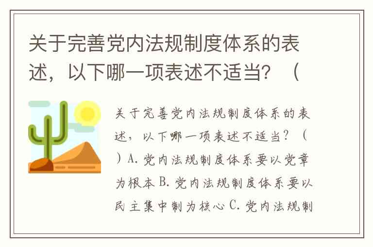 关于完善党内法规制度体系的表述,以下哪一项表述不适当?()A.党内法规制度体系要以党章为根本 B.党内法规制度体系要以民主集中制为核心 C.党内法规制度体系要以准则、条例等中央党内法规为主干 D.党内法规制度体系要以制定党的自身建设法规制度为主