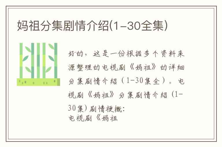 好的,这是一份根据多个资料来源整理的电视剧《妈祖》的详细分集剧情介绍(1-30集全)。