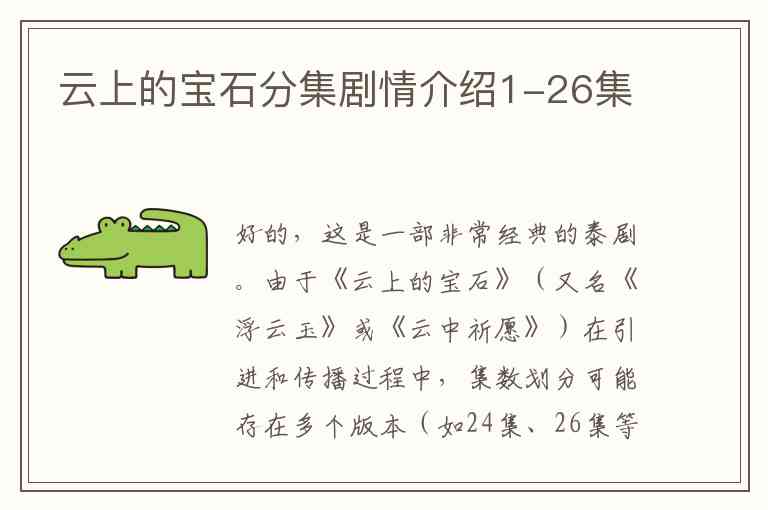 好的,这是一部非常经典的泰剧。由于《云上的宝石》(又名《浮云玉》或《云中祈愿》)在引进和传播过程中,集数划分可能存在多个版本(如24集、26集等),但核心剧情是一致的。