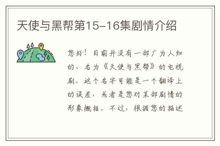 您好!目前并没有一部广为人知的、名为《天使与黑帮》的电视剧。这个名字可能是一个翻译上的误差,或者是您对某部剧情的形象概括。