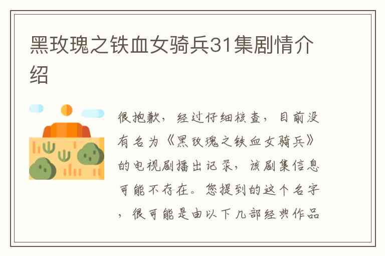 很抱歉,经过仔细核查,目前没有名为《黑玫瑰之铁血女骑兵》的电视剧播出记录,该剧集信息可能不存在。