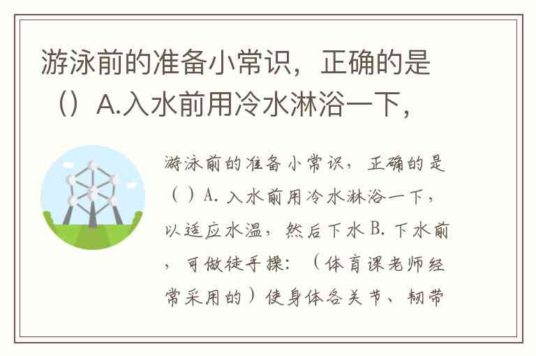 游泳前的准备小常识,正确的是()A.入水前用冷水淋浴一下,以适应水温,然后下水 B.下水前,可做徒手操:(体育课老师经常采用的)使身体各关节、韧带及身体肌肉做好充分活动准备,以防受伤 C.到天然游泳场所(如江河、水塘、水库)游泳,应该有家长、亲人或老师的带领 D.以上都正确
