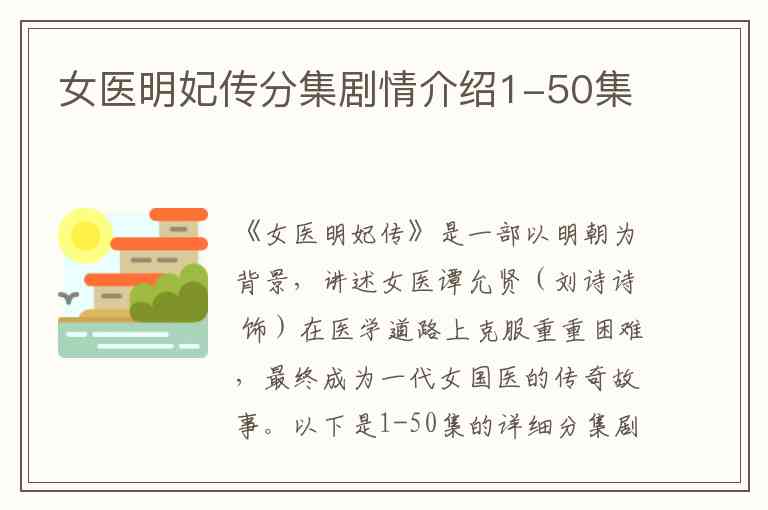 《女医明妃传》是一部以明朝为背景,讲述女医谭允贤(刘诗诗 饰)在医学道路上克服重重困难,最终成为一代女国医的传奇故事。以下是1-50集的详细分集剧情介绍: