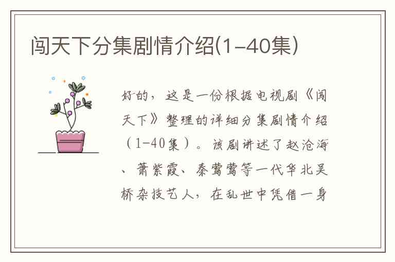 好的,这是一份根据电视剧《闯天下》整理的详细分集剧情介绍(1-40集)。该剧讲述了赵沧海、萧紫霞、秦莺莺等一代华北吴桥杂技艺人,在乱世中凭借一身绝技,为生活、为理想、为民族气节而闯荡天下的传奇故事。