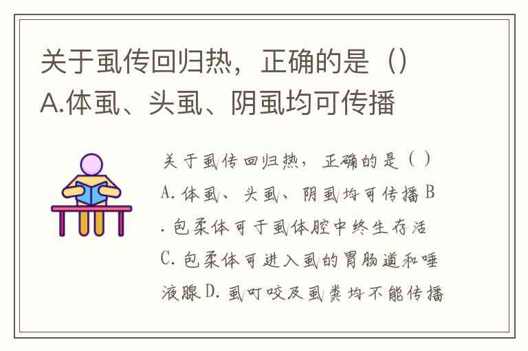 虱传回归热的传播关键在于体虱体腔中的包柔螺旋体,而非虱子的叮咬或粪便。正确答案为 B、D、E,具体解析如下: