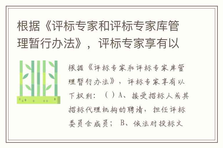根据《评标专家和评标专家库管理暂行办法》,评标专家享有以下权利:()A、接受招标人或其招标代理机构的聘请,担任评标委员会成员; B、依法对投标文件进行独立评审,提出评审意见,不受任何单位或者个人的干预; C、接受参加评标活动的劳务报酬; D、可以更改投标文件的内容。