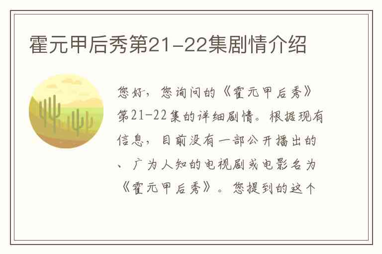 您好,您询问的《霍元甲后秀》第21-22集的详细剧情。根据现有信息,目前没有一部公开播出的、广为人知的电视剧或电影名为《霍元甲后秀》。