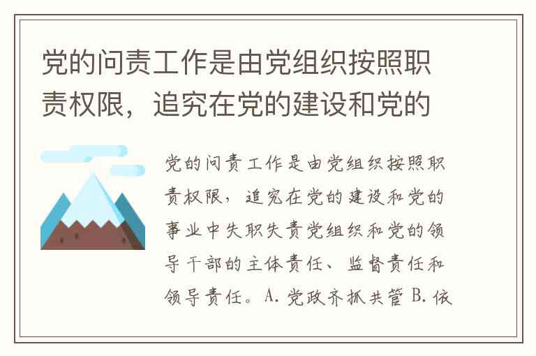 党的问责工作是由党组织按照职责权限,追究在党的建设和党的事业中失职失责党组织和党的领导干部的主体责任、监督责任和领导责任。A.党政齐抓共管 B.依纪依法办案 C.政府主要负责 D.专门机关监督