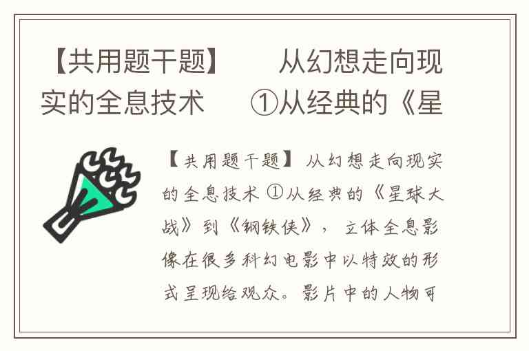 《从幻想走向现实的全息技术》第⑦段“全息摄影术目前在产品展览”中的“目前”不能删去。这个词限定了全息摄影术应用的时间范围,表明其在产品展览、发布会等场合的广泛应用是当前阶段的状况。根据原文第⑧段,“立体全息视频在实用方面目前仍难大规模应用”,且新搜索结果显示全息技术仍在快速发展中,未来可能拓展更多应用场景。删除“目前”会使表述失去时间限制,暗示这种应用状态是固定不变的,与技术动态发展的客观事实不符,体现了说明文语言的准确性和严谨性。