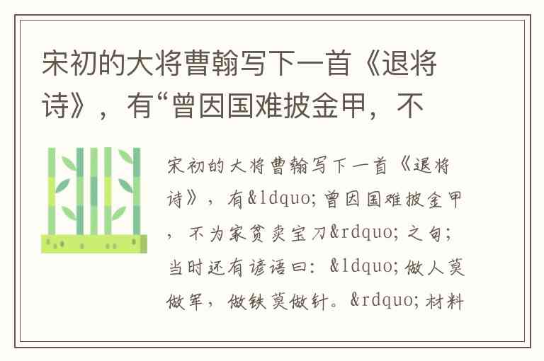 曹翰的《退将诗》与“做人莫做军,做铁莫做针”的谚语,共同揭示了宋朝重文轻武的治国方略。这种政策源于宋太祖对晚唐五代武将割据的深刻反思,通过抑制武将地位、强化文官权力来巩固中央集权,却也塑造了“兵弱而国不富”的畸形格局。