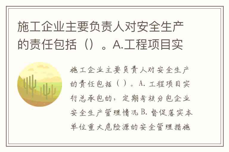 施工企业主要负责人对安全生产的责任可依据《安全生产法》及行业法规明确界定。其核心职责包括建立安全管理体系、保证安全投入、监督隐患排查等宏观管理职能,与项目负责人的现场管理职责形成区分。