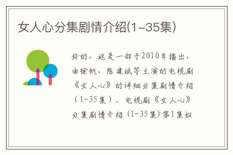 好的,这是一部于2010年播出,由徐帆、陈建斌等主演的电视剧《女人心》的详细分集剧情介绍(1-35集)。