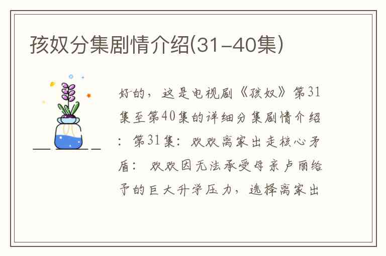 好的,这是电视剧《孩奴》第31集至第40集的详细分集剧情介绍: