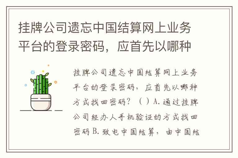 挂牌公司遗忘中国结算网上业务平台的登录密码,应首先以哪种方式找回密码?()A.通过挂牌公司经办人手机验证的方式找回密码 B.致电中国结算,由中国结算工作人员协助找回 C.通过无证书登录方式找回 D.通过法定代表人手机验证的方式找回