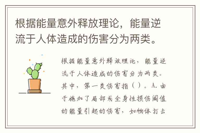 根据能量意外释放理论,能量逆流于人体造成的伤害分为两类。其中,第一类伤害指()。A.由于施加了局部或全身性损伤阈值的能量引起的伤害,如物体打击伤害等 B.由于影响了局部或全身性能量交换引起的伤害,如中毒伤害等(第二类) C.由于能量超过人体的损伤临界值导致局部或全身性的伤害,如冻伤等 D.由于接触的能量不能被屏蔽导致的局部或全身性的伤害,如触电伤害等