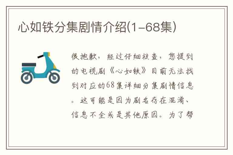 很抱歉,经过仔细核查,您提到的电视剧《心如铁》目前无法找到对应的68集详细分集剧情信息。这可能是因为剧名存在混淆、信息不全或是其他原因。