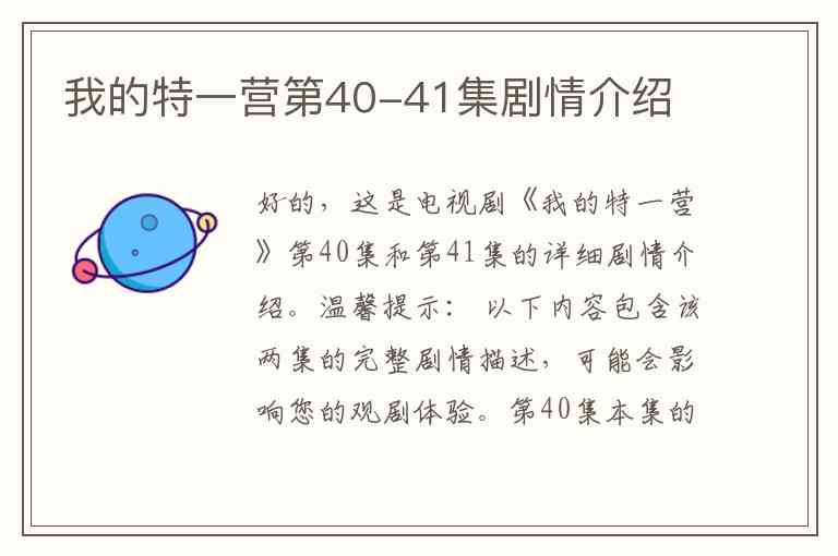 好的,这是电视剧《我的特一营》第40集和第41集的详细剧情介绍。