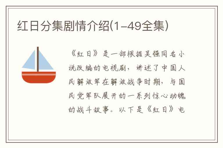 请注意,由于《红日》有多个影视改编版本,且具体分集剧情在不同版本中可能存在差异,以上剧情介绍主要基于常见的电视剧改编版本进行概括。如果您所指的是某一特定年份或特定导演的版本,情节可能会有所不同。