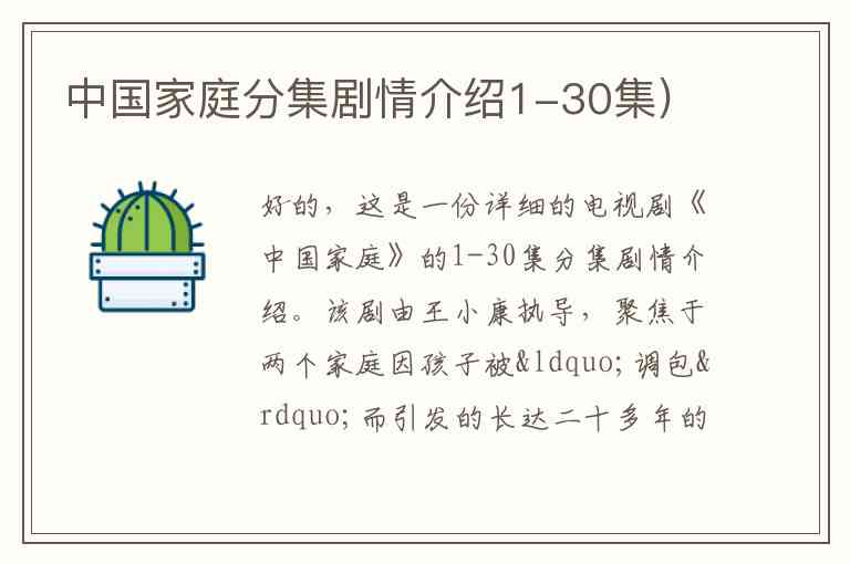 好的,这是一份详细的电视剧《中国家庭》的1-30集分集剧情介绍。该剧由王小康执导,聚焦于两个家庭因孩子被“调包”而引发的长达二十多年的情感纠葛、矛盾冲突与人性救赎。