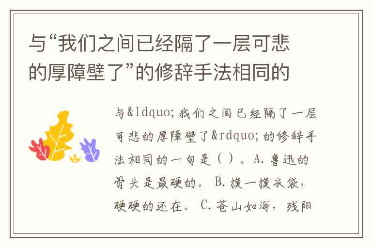 与“我们之间已经隔了一层可悲的厚障壁了”的修辞手法相同的一句是()。A.鲁迅的骨头是最硬的。 B.摸一摸衣袋,硬硬的还在。 C.苍山如海,残阳如血。 D.最可恨那些毒蛇猛兽,吃尽了我们的血肉。