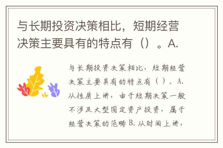 与长期投资决策相比,短期经营决策主要具有的特点有()。A.从性质上讲,由于短期决策一般不涉及大型固定资产投资,属于经营决策的范畴 B.从时间上讲,短期经营决策只涉及一年以内的一次性专门业务,决策结果的影响较短 C.从方法上讲,短期决策一般不考虑货币时间价值因素和风险因素 D.从决策者层次上讲,短期经营决策主要是较低管理层次的决策,长期投资决策主要是较高管理层次的决策