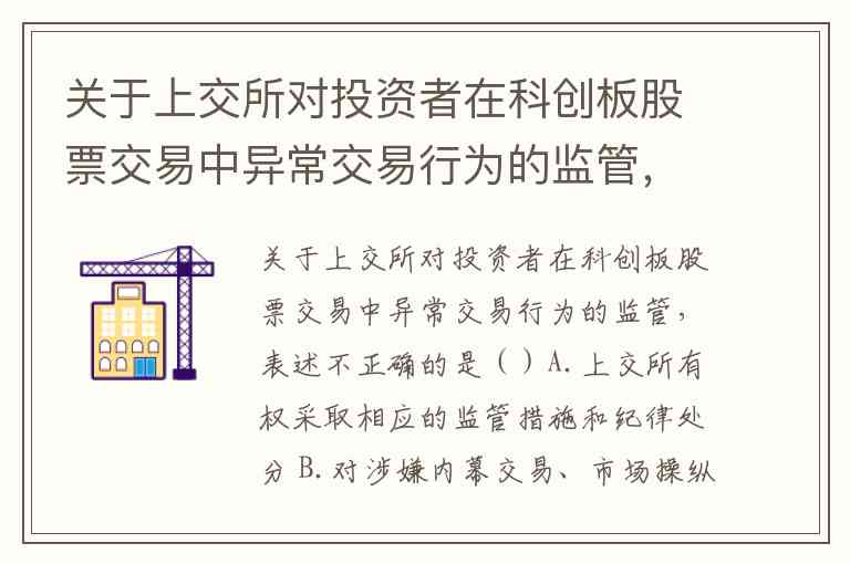 关于上交所对投资者在科创板股票交易中异常交易行为的监管,表述不正确的是()A.上交所有权采取相应的监管措施和纪律处分 B.对涉嫌内幕交易、市场操纵等违法违规行为,上交所有权依法上报中国证监会查处 C.对于严重影响证券交易秩序或者交易公平的异常交易行为,上交所可以对相关投资者采取限制账户交易等措施 D.上交所不能采取监管措施或纪律处分