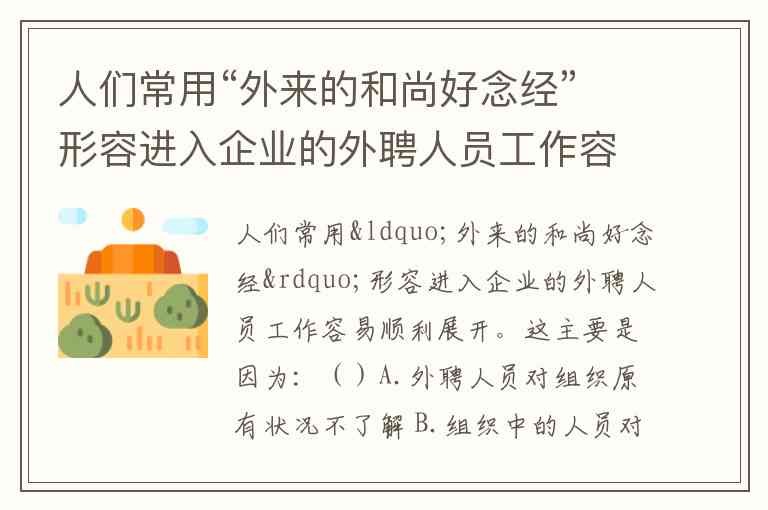 人们常用“外来的和尚好念经”形容进入企业的外聘人员工作容易顺利展开。这主要是因为:()A.外聘人员对组织原有状况不了解 B.组织中的人员对外来人员历史不了解 C.外聘人员一开始更会吃苦耐劳 D.外聘人员具有更高的业务素质