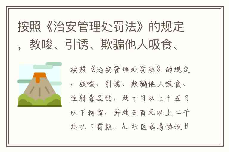 按照《治安管理处罚法》的规定,教唆、引诱、欺骗他人吸食、注射毒品的,处十日以上十五日以下拘留,并处五百元以上二千元以下罚款。A.社区戒毒协议 B.戒毒脱瘾协议 C.戒毒劳动义务 D.以上答案都不正确